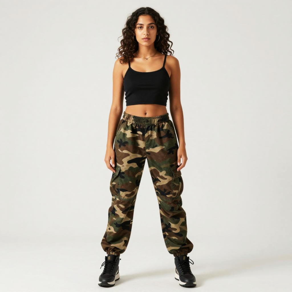 A woman confidently poses wearing a pair of camouflage cargo pants paired with a black cropped tank top, embodying a casual hip-hop streetwear style. Her curly hair and minimal accessories complement the relaxed and edgy ensemble, perfect for urban fashion lovers.