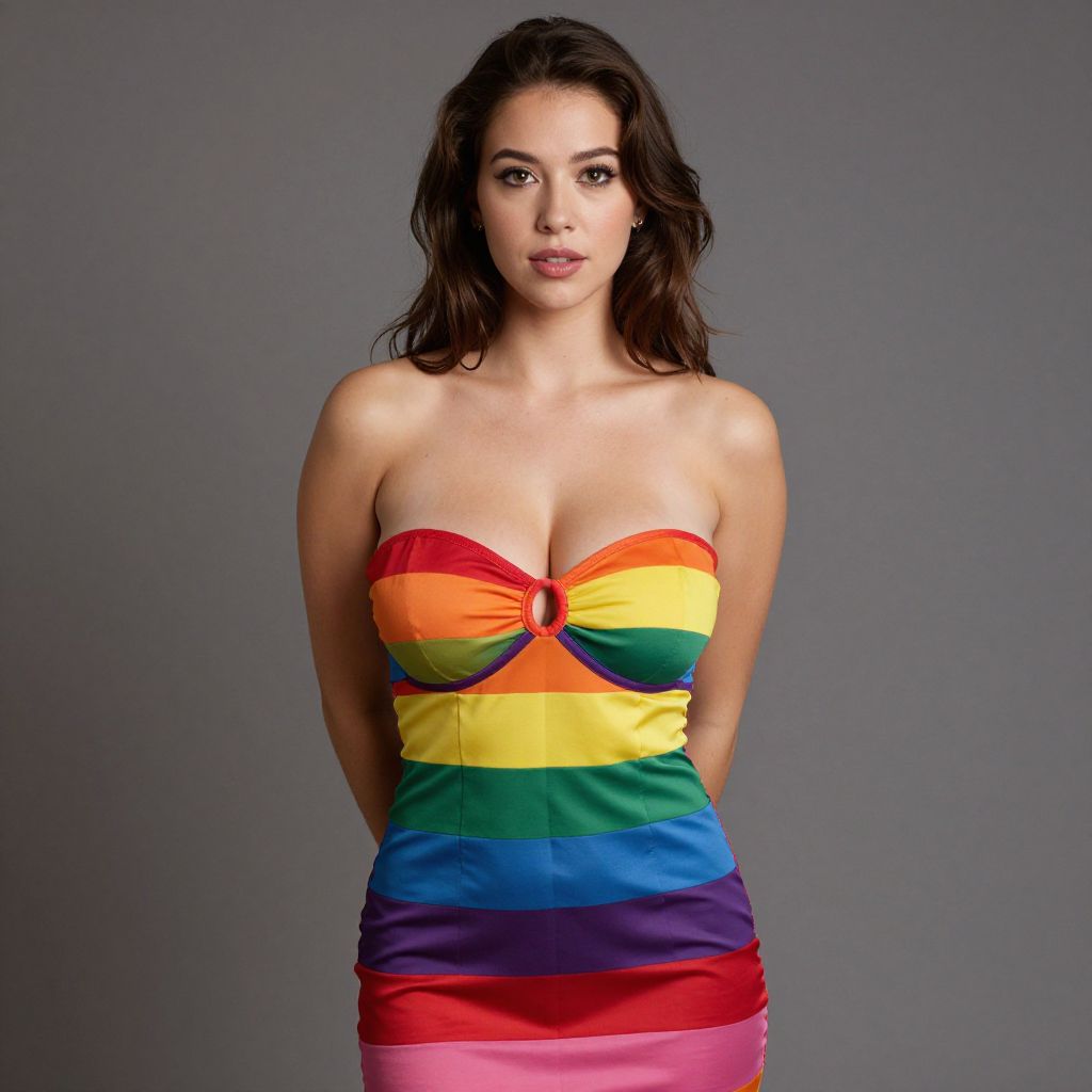 A confident young woman poses against a neutral gray background wearing a strapless dress featuring bold horizontal stripes in rainbow colors, symbolizing LGBTQ+ pride. Her natural makeup and loose dark hair enhance the vibrant and empowering aesthetic of the portrait.