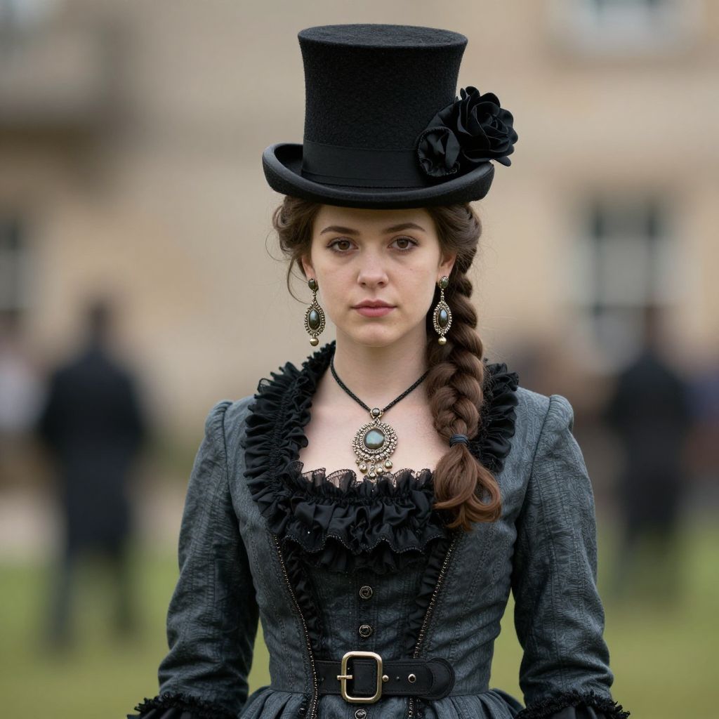 Elegant Victorian Woman in Gothic Style Dress with Top Hat Outdoors