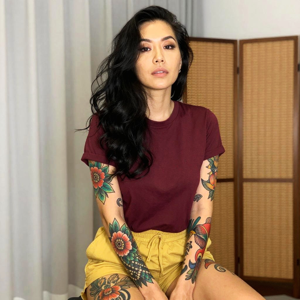 Confident Woman with Floral Tattoos Wearing Burgundy T-Shirt and Yellow Shorts