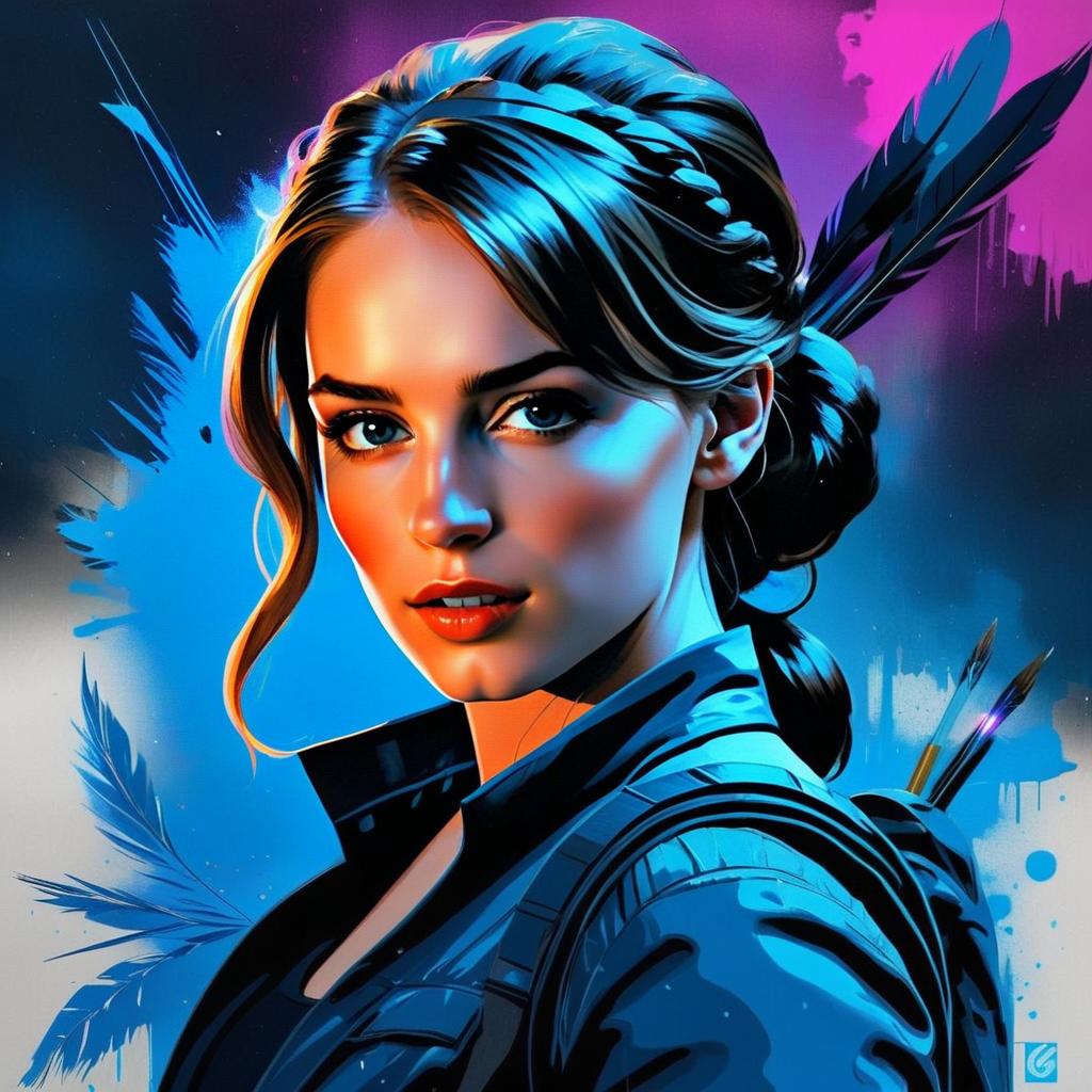 This digital artwork portrays a confident woman with braided hair styled into a bun, highlighted with striking blue and orange lighting effects that give her a luminous, almost futuristic glow. The composition includes a quiver with arrows on her back, complemented by dynamic brushstroke elements and rich color contrasts, blending realism with a graphic novel or pop art style.