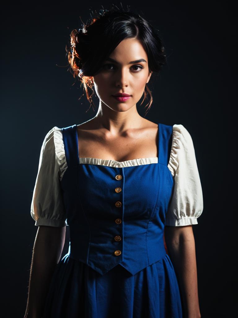 A woman dressed in a realistic cosplay outfit inspired by the character Luca, featuring a blue dress with gold buttons and puffy white sleeves. The photo captures a dramatic, low-key lighting style that highlights her facial features and costume details against a dark background.