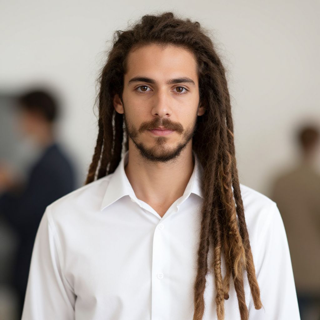 A confident young man with long dreadlocks and a neatly trimmed beard stands facing the camera, wearing a white button-up shirt. The image features a shallow depth of field with a blurred background where two indistinct figures are visible, creating a professional and clean portrait style.