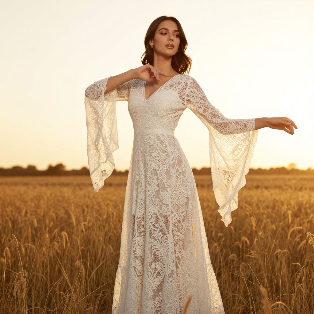 A woman stands gracefully in a sunlit field, wearing an elegant white lace dress with flowing bell sleeves. The soft golden light of sunset enhances the intricate floral patterns of the dress, creating a romantic and ethereal atmosphere.