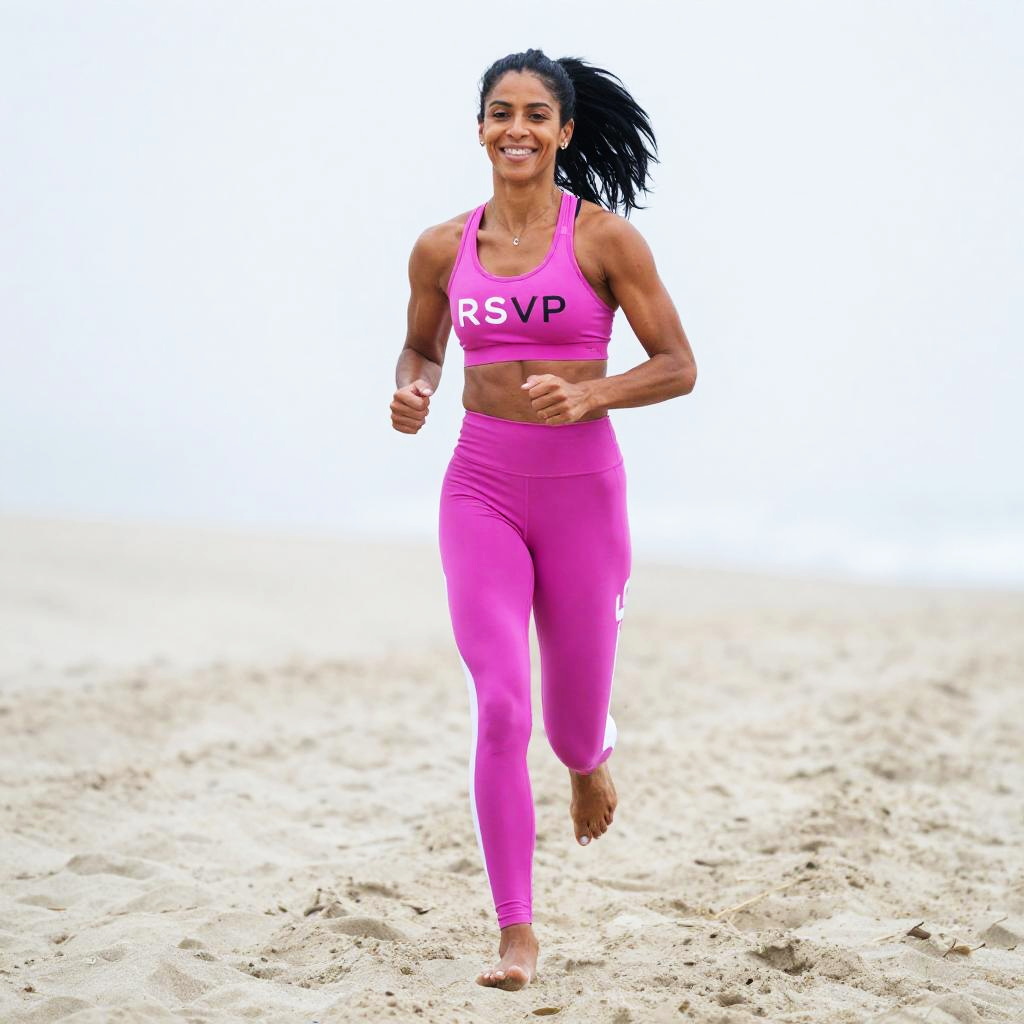 A fit woman is running barefoot on a sandy beach, wearing vibrant pink athletic wear consisting of a sports bra with 'RSVP' text and matching leggings. She appears energetic and happy, showcasing a healthy and active lifestyle in an outdoor coastal setting with a minimalistic background.