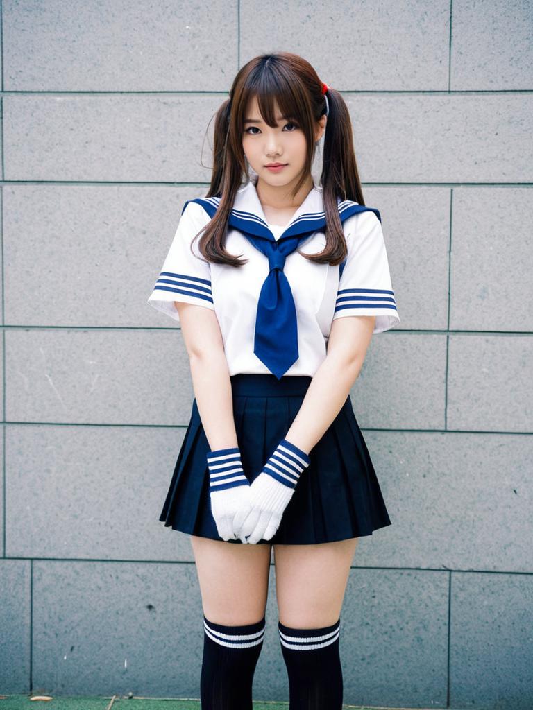 A young woman dressed in a traditional Japanese school uniform stands against a stone tiled wall. She wears a white sailor top with navy blue stripes, a matching navy pleated skirt, knee-high socks, and white gloves, styled with her hair in twin ponytails. The image has a clean, realistic photography style capturing a serene and composed expression.
