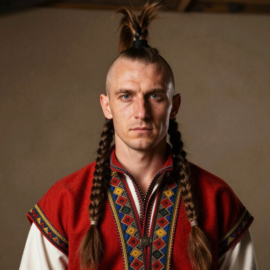 Gen Z Man with Traditional Eastern European Embroidered Outfit and Braided Hairstyle