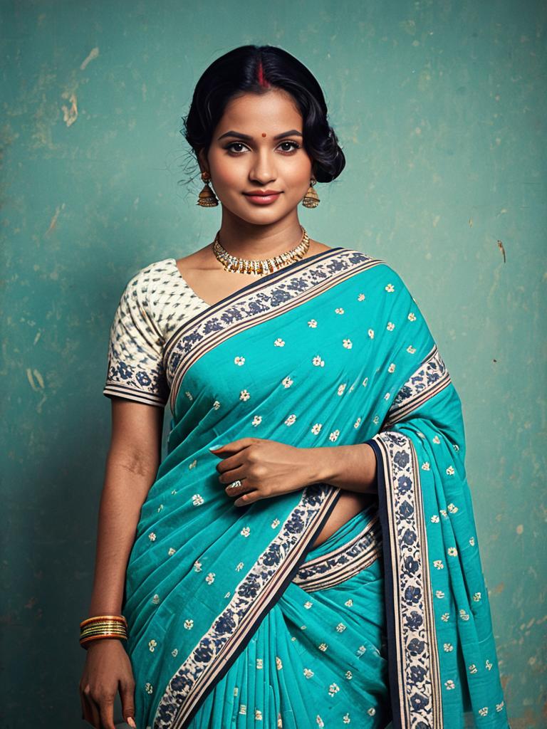 A woman dressed in a traditional malmal cotton saree poses gracefully against a rustic teal background at a cultural gathering. The saree features a delicate floral pattern with intricate borders, complemented by elegant jewelry and a classic hairstyle.