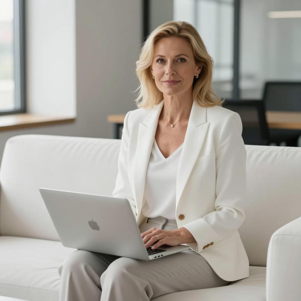 A confident middle-aged woman dressed in a white blazer and light-colored trousers is seated on a modern white sofa, working on a silver laptop. The bright, minimalist office setting with large windows and a neutral color palette highlights a professional and focused atmosphere.