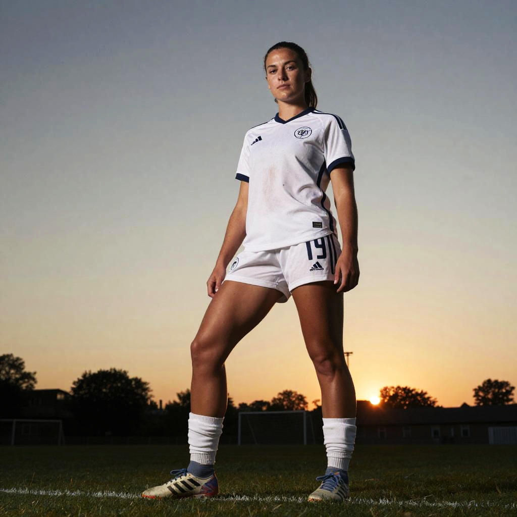 Confident Woman Soccer Player in Adidas Uniform on Field at Sunset