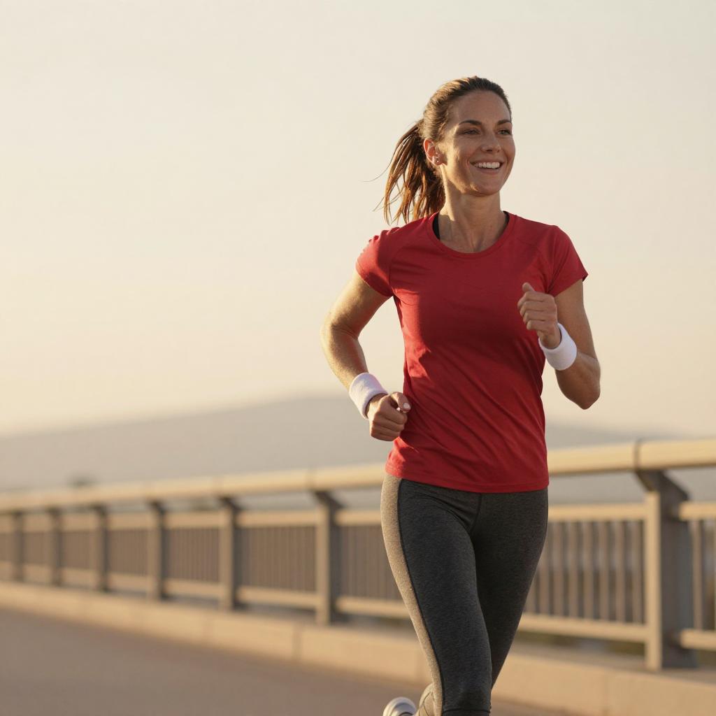 A young woman jogs outdoors on a bridge during early morning or late afternoon, wearing a red athletic shirt and grey leggings. She appears joyful and focused, embodying a healthy and active lifestyle in a natural light setting.