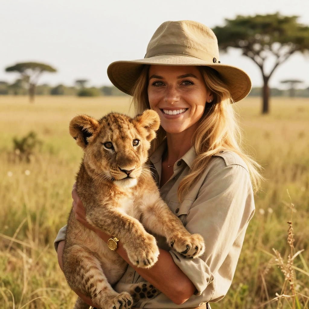 A smiling woman dressed in safari attire holds a young lion cub in an open savanna. The bright natural light highlights the serene connection between the woman and the animal, set against a backdrop of acacia trees and tall grass. This image captures the essence of wildlife adventure and conservation in an authentic outdoor environment.