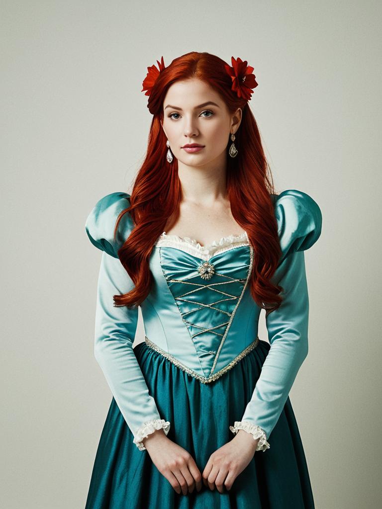 A woman with long red hair styled with red flower accessories wears an elegant teal and turquoise ariel-inspired fancy dress costume. The dress features puffed sleeves, a corset-style bodice with delicate lace detailing, and a flowing skirt, perfectly capturing a vintage fairytale aesthetic.