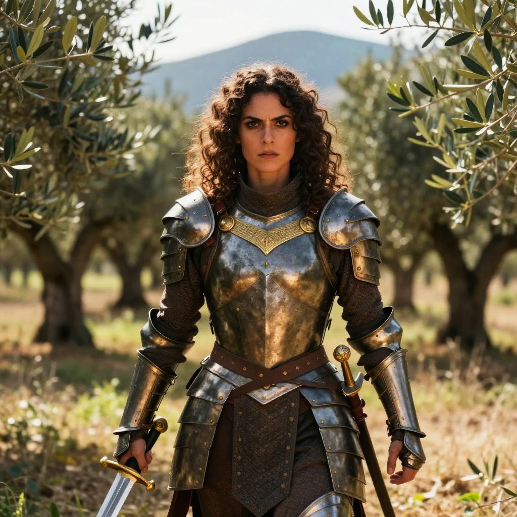 A determined woman clad in a full suit of medieval armor stands amidst an olive grove, holding a sword in one hand with a second sword sheathed at her side. Her curly hair and intense gaze convey strength and resilience, set against a natural, sunlit backdrop.