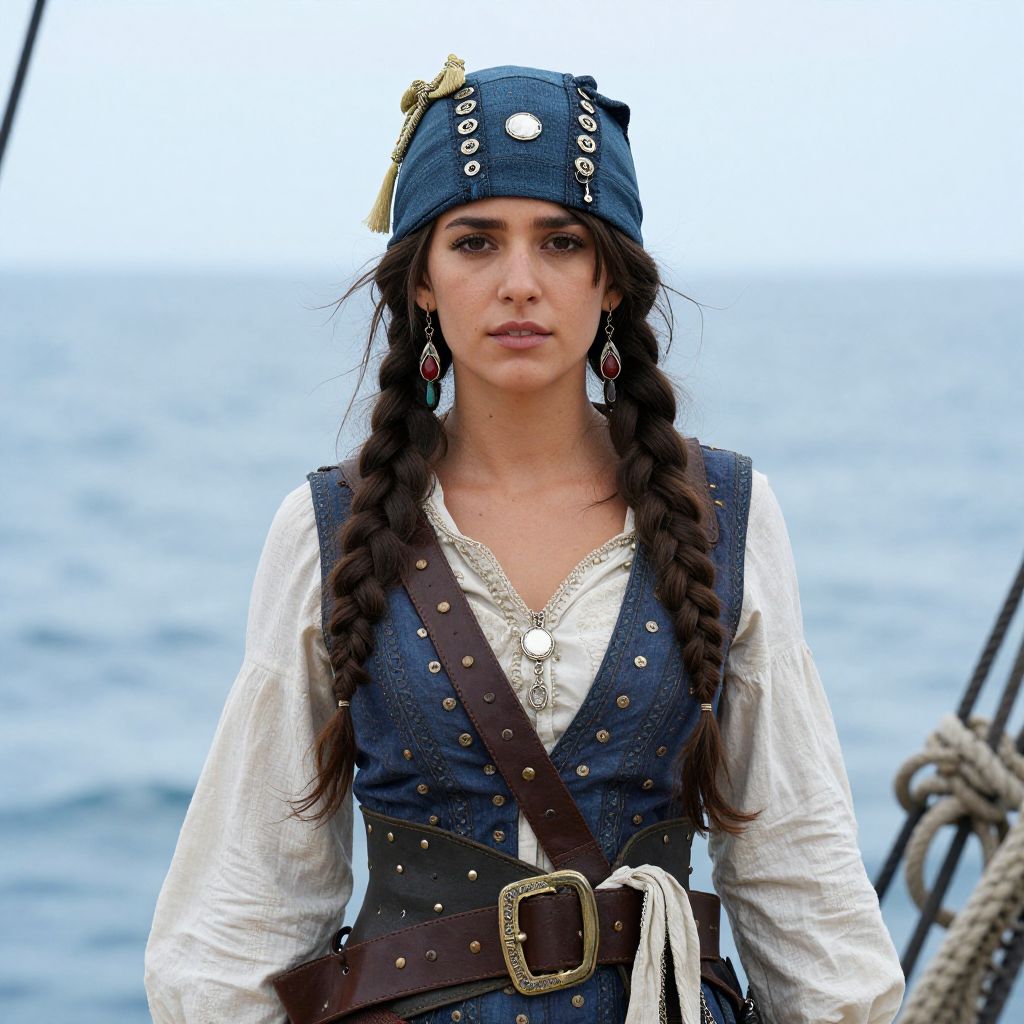 A young woman dressed in a detailed pirate costume stands on deck with the sea in the background. Her outfit features braided hair, a blue headscarf adorned with buttons, a leather belt, and a vest accented with metal studs, reflecting a classic pirate style.