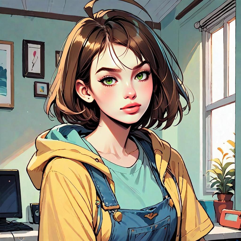 A digitally illustrated young woman with striking green eyes and short brown hair styled in a casual bob. She wears a yellow hoodie over a teal shirt and denim overalls, standing in a warmly lit room with framed artwork and a window revealing sunlight and a potted plant. The artwork is rendered in a vibrant anime-inspired style, blending detailed shading and bright colors to create a soft yet lively atmosphere.