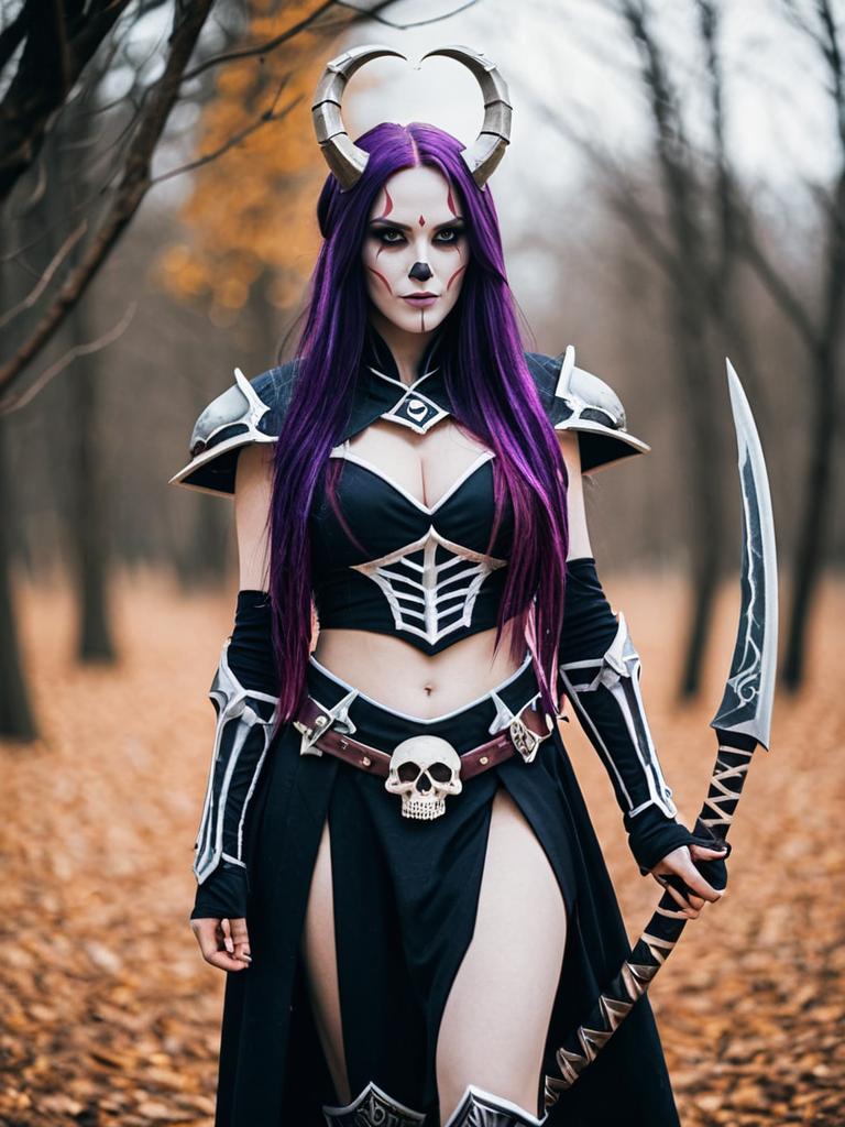 A woman dressed as a dark fantasy warrior with striking purple hair and intricate horned headgear stands confidently in an autumn forest. Her costume features bone and skull motifs, armored shoulder pads, and a decorated curved blade, blending gothic and fantasy elements with a dramatic makeup style. The moody backdrop of fallen leaves enhances the mystical and powerful vibe of the character.