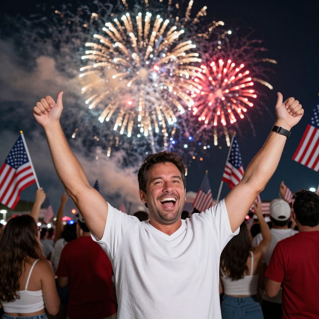 A joyful man in a white shirt raises his arms in celebration during a vibrant fireworks display at night. The crowd around him waves American flags, creating a festive and patriotic atmosphere.
