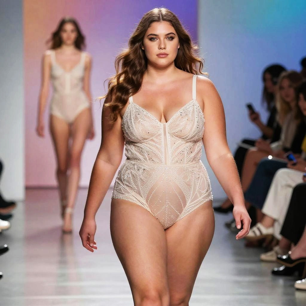 A confident plus-size woman walks the runway wearing a sheer, intricately beaded bodysuit that highlights contemporary lingerie fashion. The image captures the essence of body positivity and empowerment within a modern, elegant runway setting.