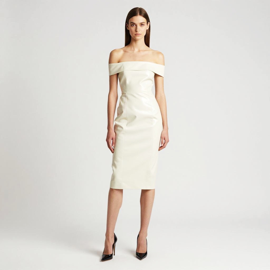 A woman stands confidently wearing a sleek, off-the-shoulder white midi dress that highlights minimalist elegance and modern style. Her straight hair and black high heels complete the sophisticated, contemporary look against a clean, neutral background.