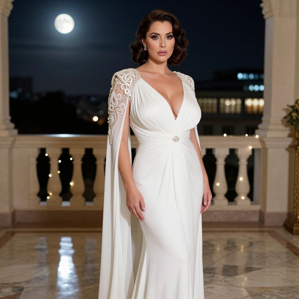 A woman elegantly poses on a balcony at night, wearing a stunning white gown with intricate beaded shoulder details and a flowing cape. The full moon and city lights create a sophisticated backdrop, enhancing the glamorous and timeless style of the scene.