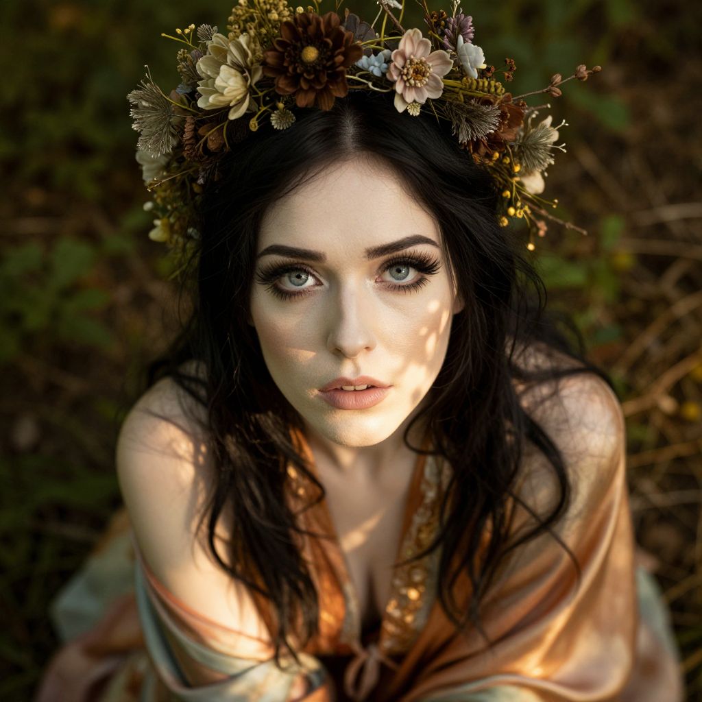 A striking portrait of a woman with piercing blue eyes and dark hair, adorned with a rustic floral crown composed of dried and fresh flowers. The warm, soft lighting and natural earthy tones create an ethereal and timeless bohemian aesthetic. The composition focuses closely on her face, highlighting both her intense gaze and the delicate texture of the floral crown.