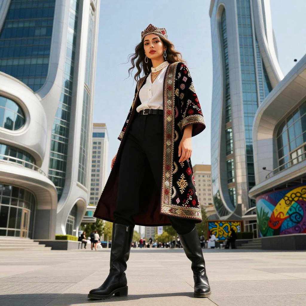 A confident woman stands in an urban setting, wearing a stylish ensemble that combines traditional and modern fashion elements. She sports a richly embroidered long coat and a jeweled crown, paired with a white blouse, black high-waisted pants, and knee-high black boots, creating a striking blend of contemporary chic and cultural heritage.