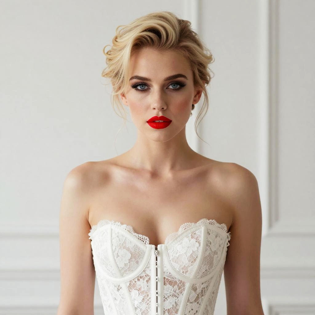 Glamorous Woman in White Lace Corset with Bold Red Lipstick