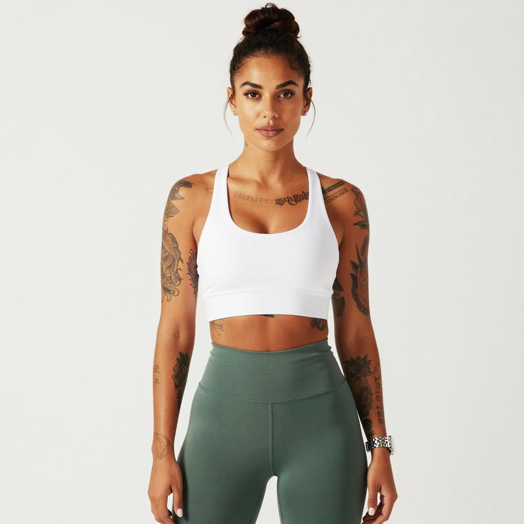 A confident woman with tattoos and a high bun hairstyle stands against a plain white background, showcasing activewear composed of a white sports bra and high-waisted green leggings. The image emphasizes fitness, strength, and modern athletic style with a minimalistic studio setting.