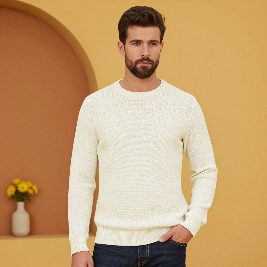 Bearded Man Wearing Cream Knit Sweater in Warm Earth-Toned Setting