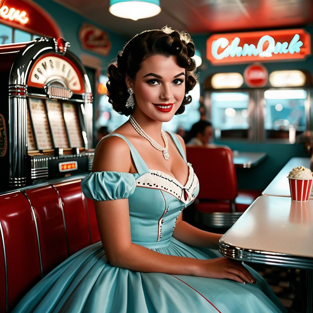 A smiling woman dressed in a vintage 1950s style blue dress with puffed sleeves and pearl jewelry sits at a classic diner booth. The retro ambiance is enhanced by the jukebox and neon signage in the background, evoking a nostalgic mid-century American atmosphere.