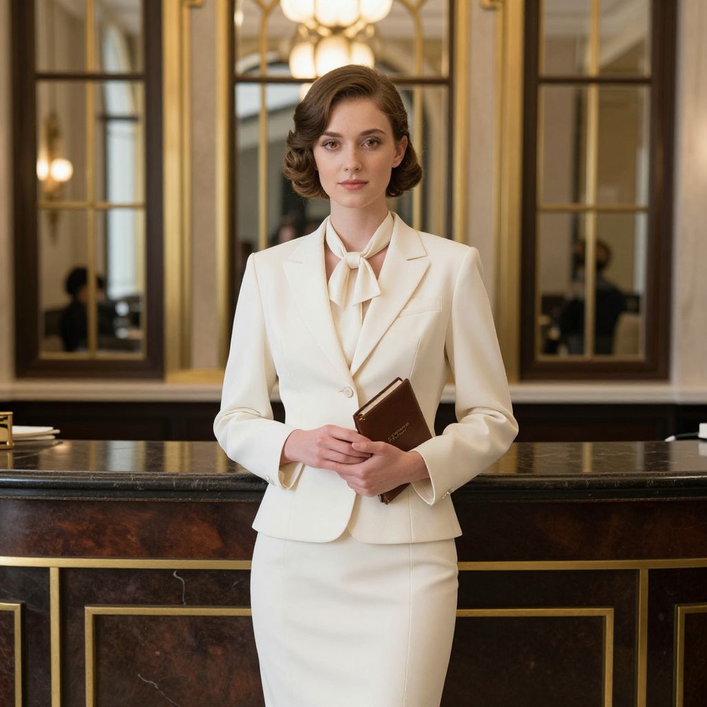 A sophisticated woman stands confidently behind a polished marble counter, dressed in an elegant cream-colored suit with a matching bow-tie blouse. The classic and professional setting, enhanced by warm lighting and ornate mirrors, evokes a timeless and refined atmosphere.