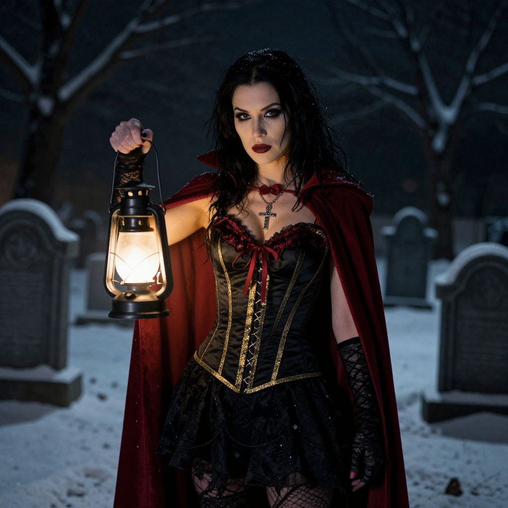 A woman dressed in a gothic Victorian-style outfit with a black corset and red cape holds a glowing lantern in a snowy graveyard at night. Her dark makeup, intense expression, and the eerie atmosphere of the tombstones create a mysterious and haunting scene.