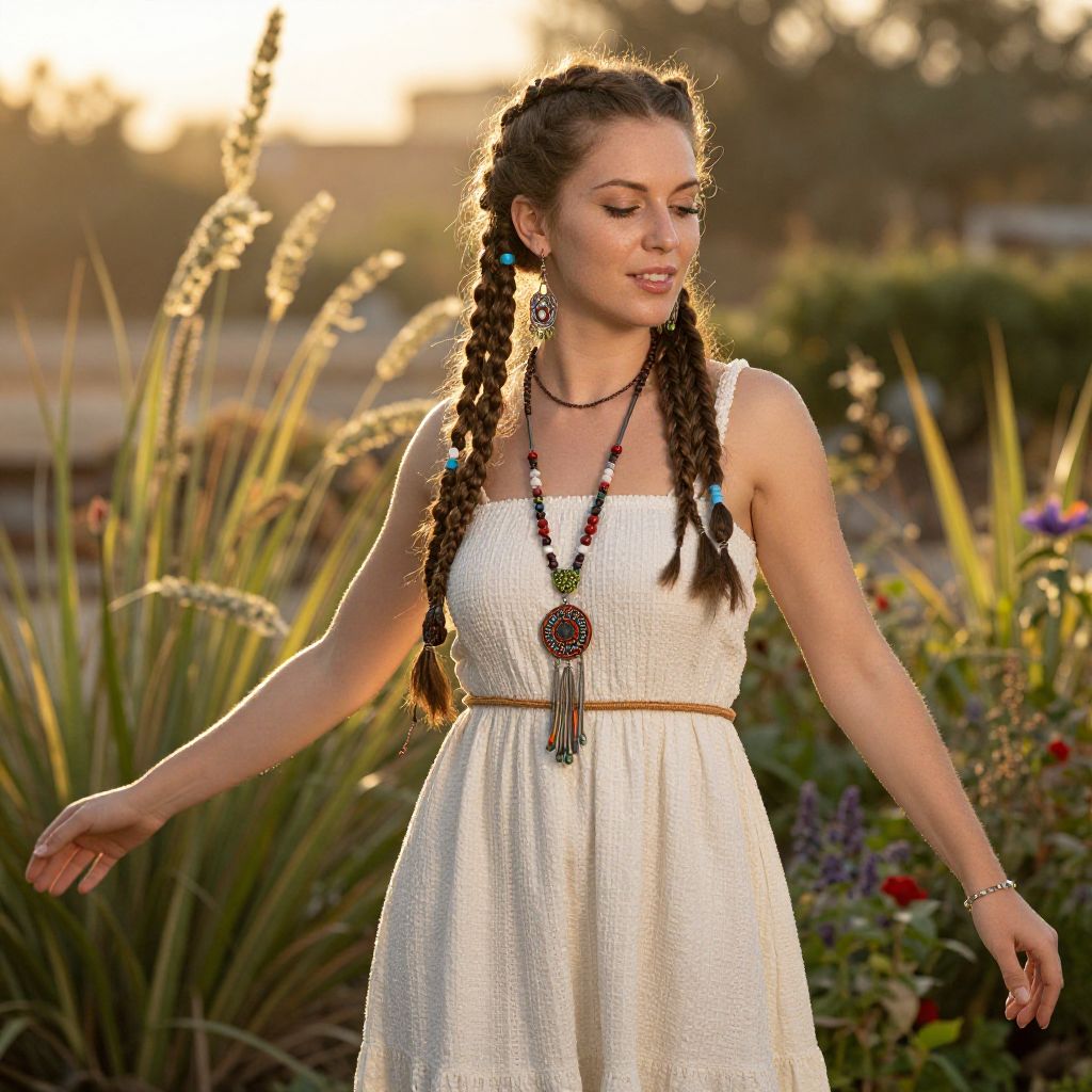A woman with braided hair wearing a white sundress and colorful beaded jewelry stands gracefully in a garden during golden hour. The warm sunlight enhances the serene and bohemian vibe of the outdoor setting.
