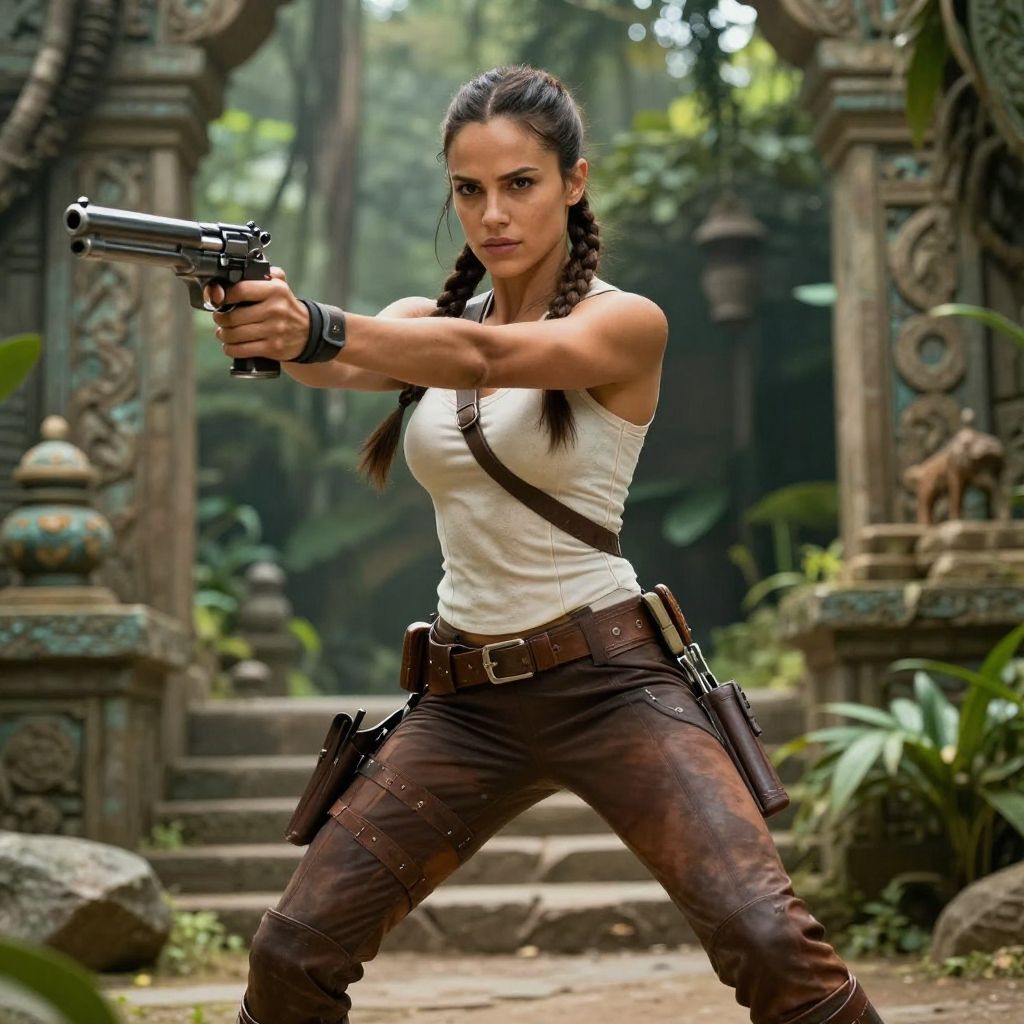 A determined woman dressed in rugged adventure gear aims two pistols with precision in a lush, ancient temple setting. The scene captures an intense action moment, highlighting her strength and focus in a dramatic outdoor environment.
