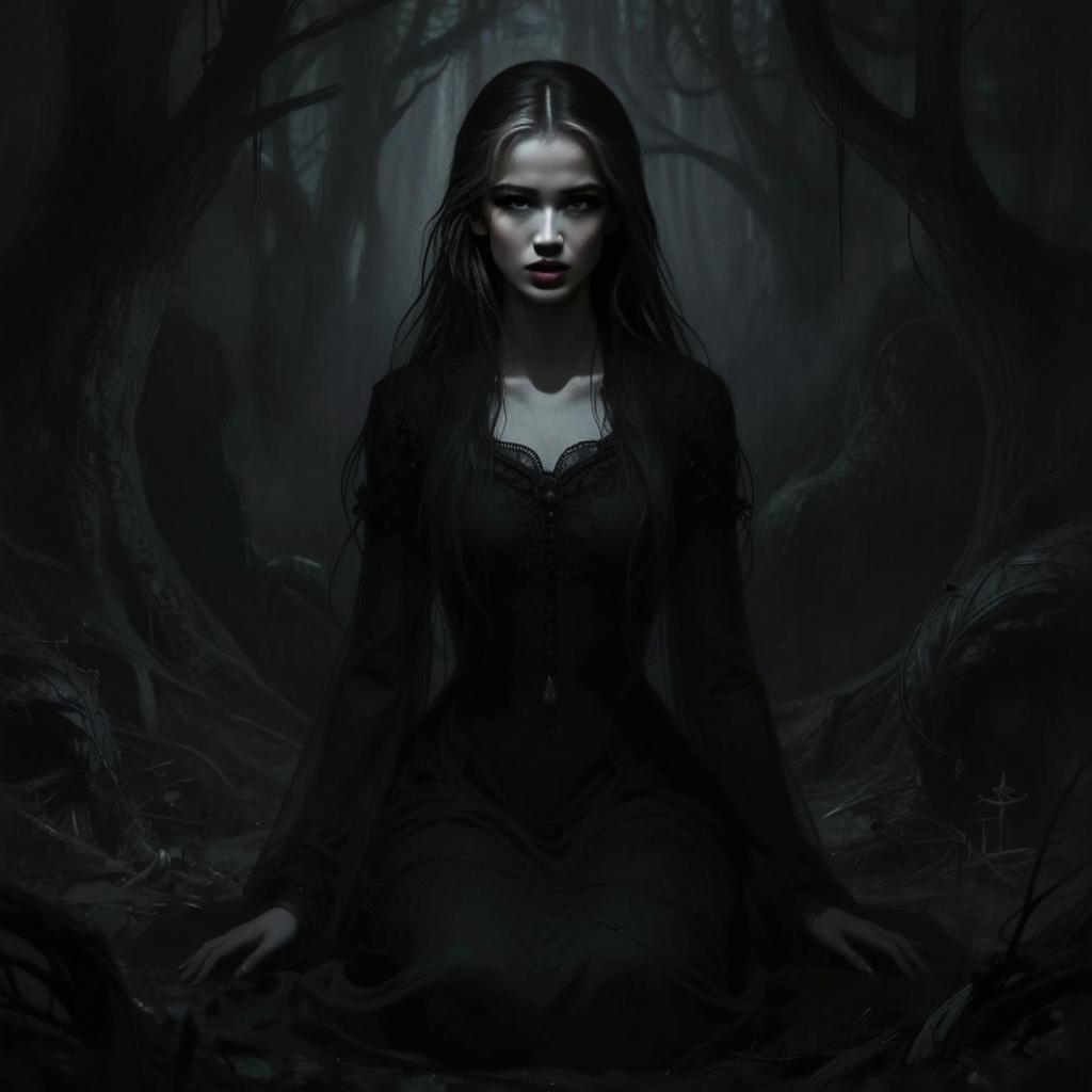 A mysterious woman dressed in a dark, gothic gown sits calmly amidst an eerie forest setting, shrouded in shadows and mist. The image evokes a moody, fantasy atmosphere with dramatic lighting emphasizing her pale complexion and intense gaze, highlighting elements of dark fantasy and gothic portraiture.
