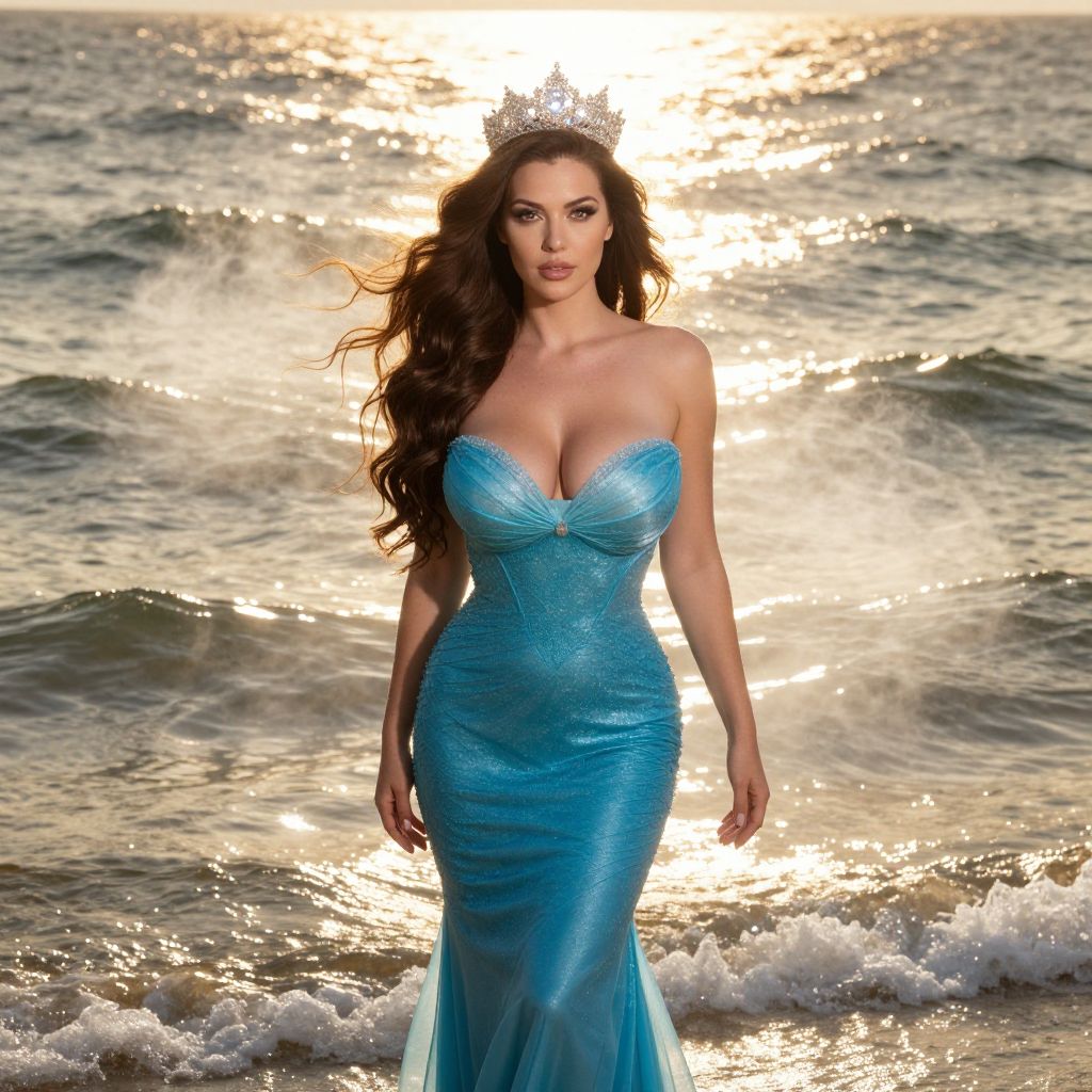 A stunning woman wearing a shimmering blue mermaid-style gown and a sparkling crown stands confidently at the ocean shore during golden hour. The soft waves and warm sunlight create a magical and regal atmosphere around her.