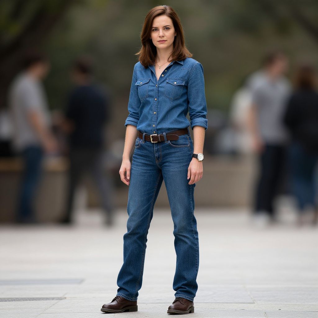 A confident woman stands outdoors in an urban setting, dressed in a casual denim outfit consisting of a button-up shirt and jeans. The image features a shallow depth of field with blurred figures in the background, highlighting the subject's poised stance and direct gaze.