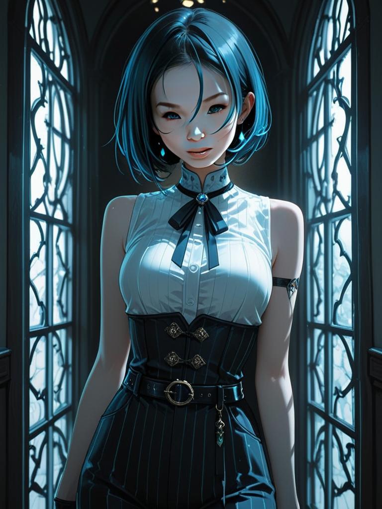 A striking digital illustration of a woman with short blue hair standing in front of intricate iron-framed windows. She wears a stylish, pinstriped corset dress with a high collar and a black ribbon, showcasing a modern gothic and dark illustrious aesthetic. The artwork blends detailed character design with a moody, atmospheric background, characteristic of contemporary digital fantasy art.