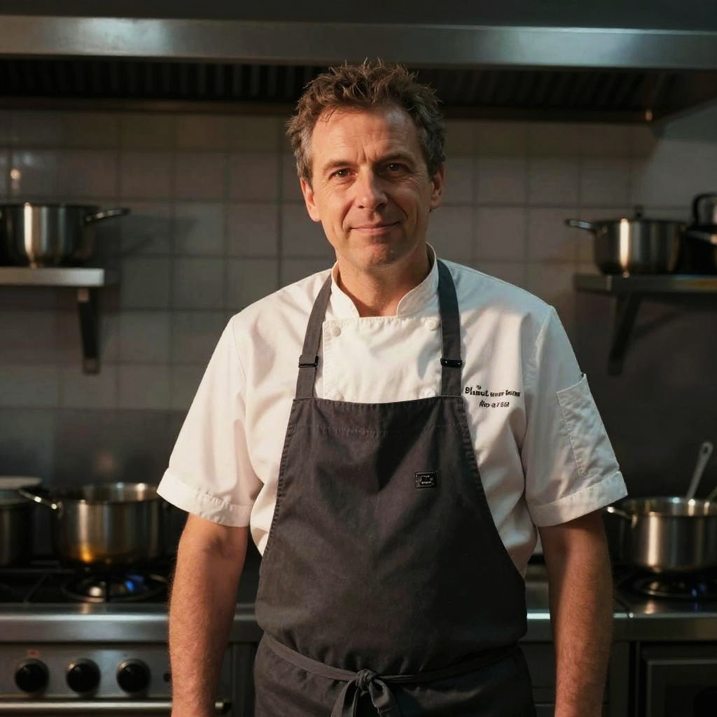 A confident male chef stands in a professional kitchen, dressed in a white chef's jacket and a dark apron. The background features stainless steel pots and a tiled wall, highlighting the culinary environment.