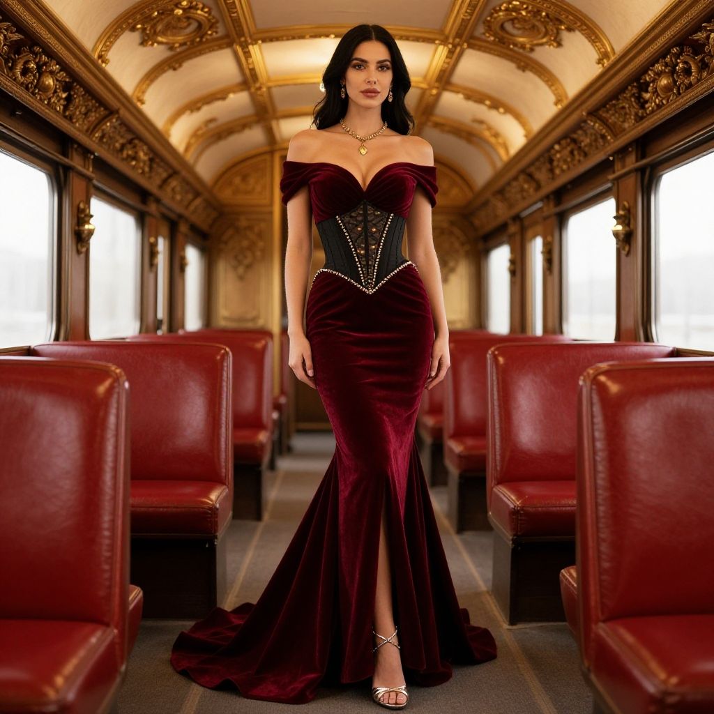 A woman elegantly poses inside a vintage train carriage, wearing a luxurious off-shoulder burgundy velvet gown with a black corset adorned with embellishments. The opulent setting, featuring rich red leather seats and ornate gold detailing on the ceiling, enhances the sophisticated and classic ambiance of the photograph.