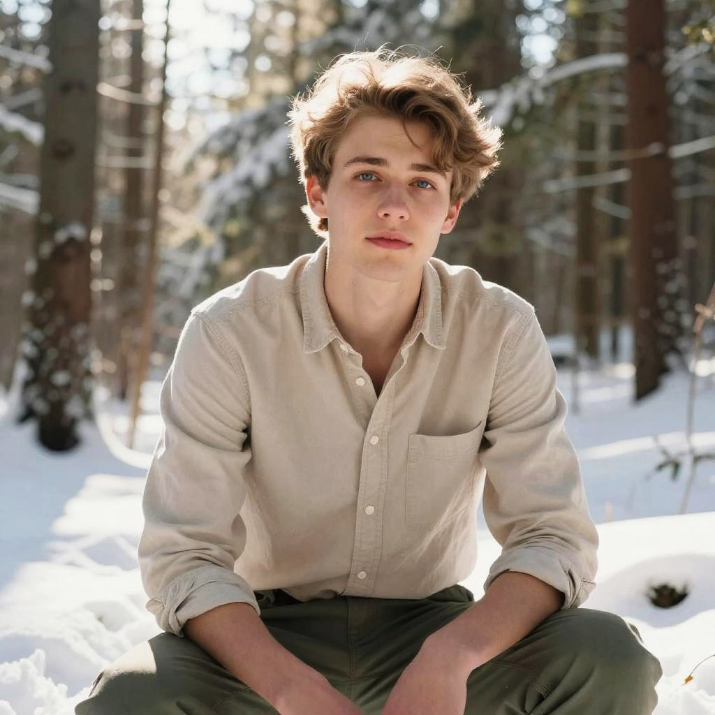 A young man with tousled hair and blue eyes sits outdoors in a snowy forest, dressed casually in a light beige shirt and olive green pants. The natural lighting highlights his contemplative expression against the serene winter background, capturing a moment of calm and connection with nature.