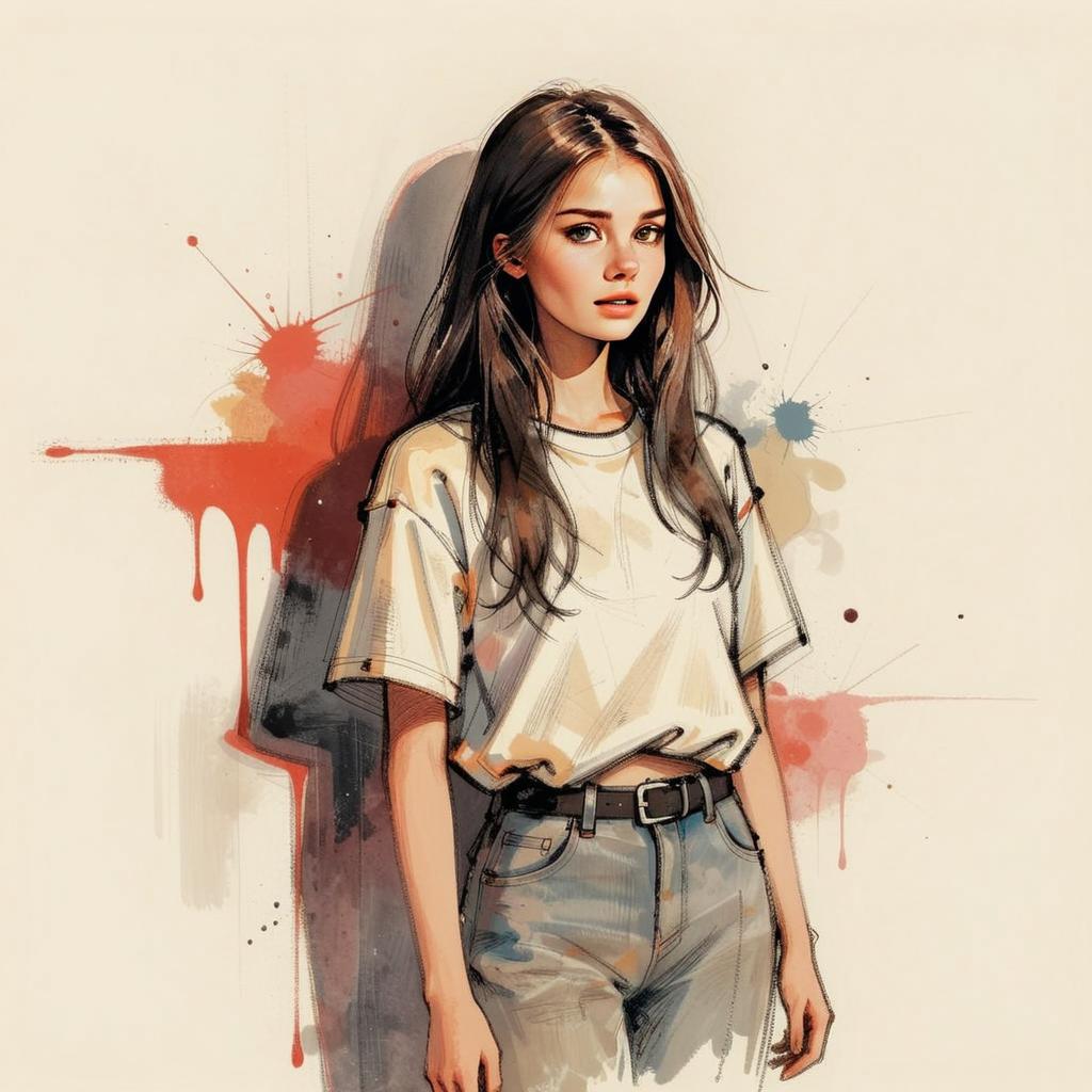 This digital artwork features a stylish young woman with long flowing hair, dressed in a casual white t-shirt and light blue jeans, standing against a background accented with dynamic paint splatters and drips. The image combines realistic portraiture with an illustrative and sketch-like style, blending fine line work and watercolor textures to create a modern, expressive look.