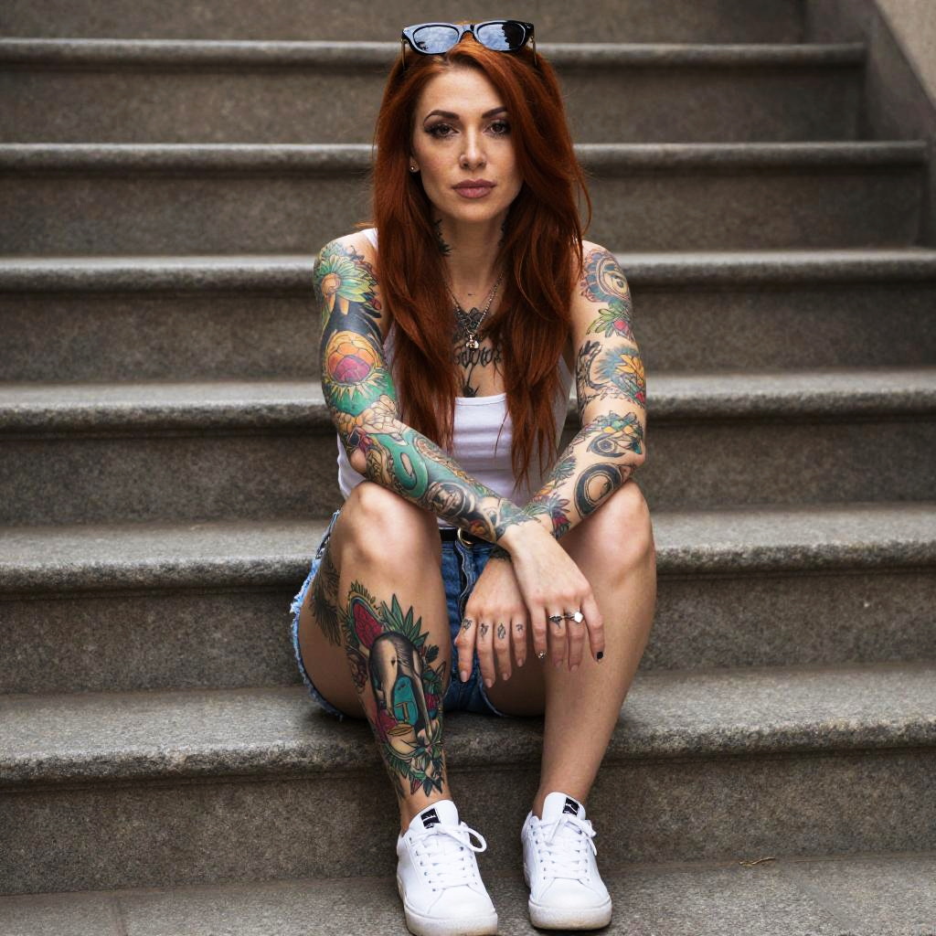 A confident red-haired woman with extensive colorful tattoos on her arms and legs sits on outdoor stone steps, wearing a white tank top, denim shorts, and white sneakers. She gazes directly at the camera, with sunglasses resting on her head, showcasing her edgy and artistic personal style.