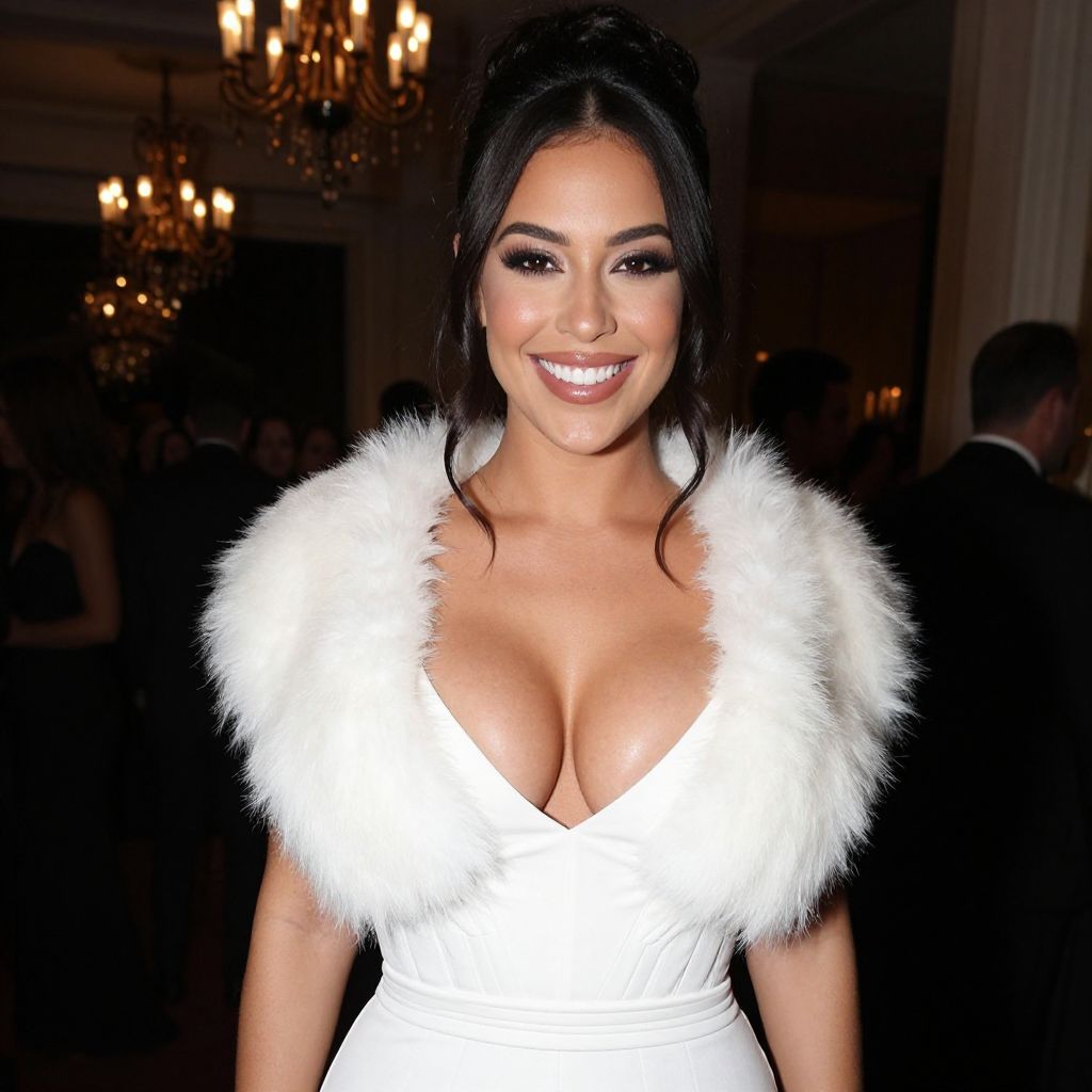 A glamorous woman in an elegant white dress with a fluffy fur stole poses confidently at a formal evening event. The sophisticated setting features chandeliers and softly lit interiors, adding to the luxurious atmosphere.