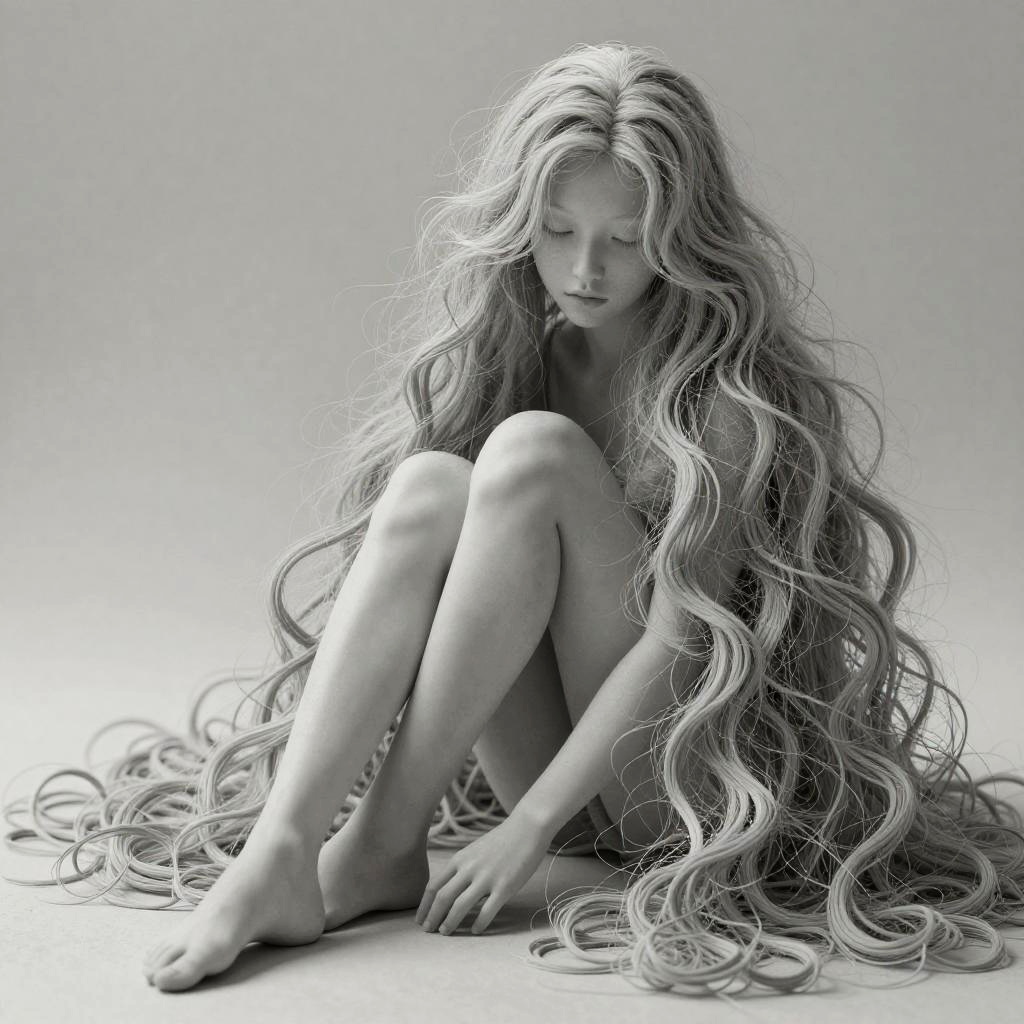 A young woman with exceptionally long, flowing hair sits in a contemplative pose, her eyes gently closed. The soft monochrome palette enhances the delicate and serene mood, highlighting the intricate texture and volume of her cascading locks.