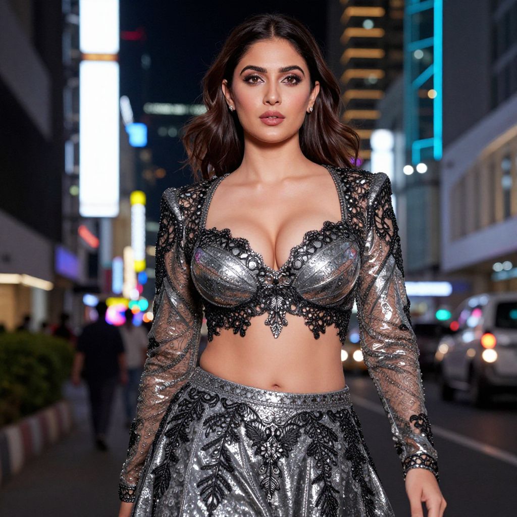A woman stands confidently on a vibrant city street at night, dressed in an intricate and shimmering silver and black embroidered outfit. The ensemble features metallic textures with detailed lace accents, highlighting a contemporary and glamorous style against a backdrop of illuminated urban architecture.