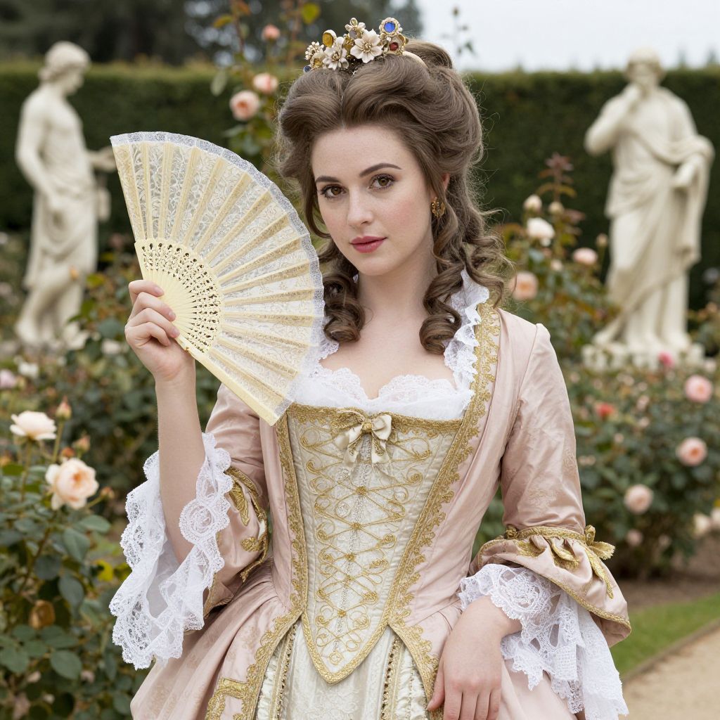 Rococo Style Woman in Elegant 18th Century Gown with Lace Fan in Rose Garden