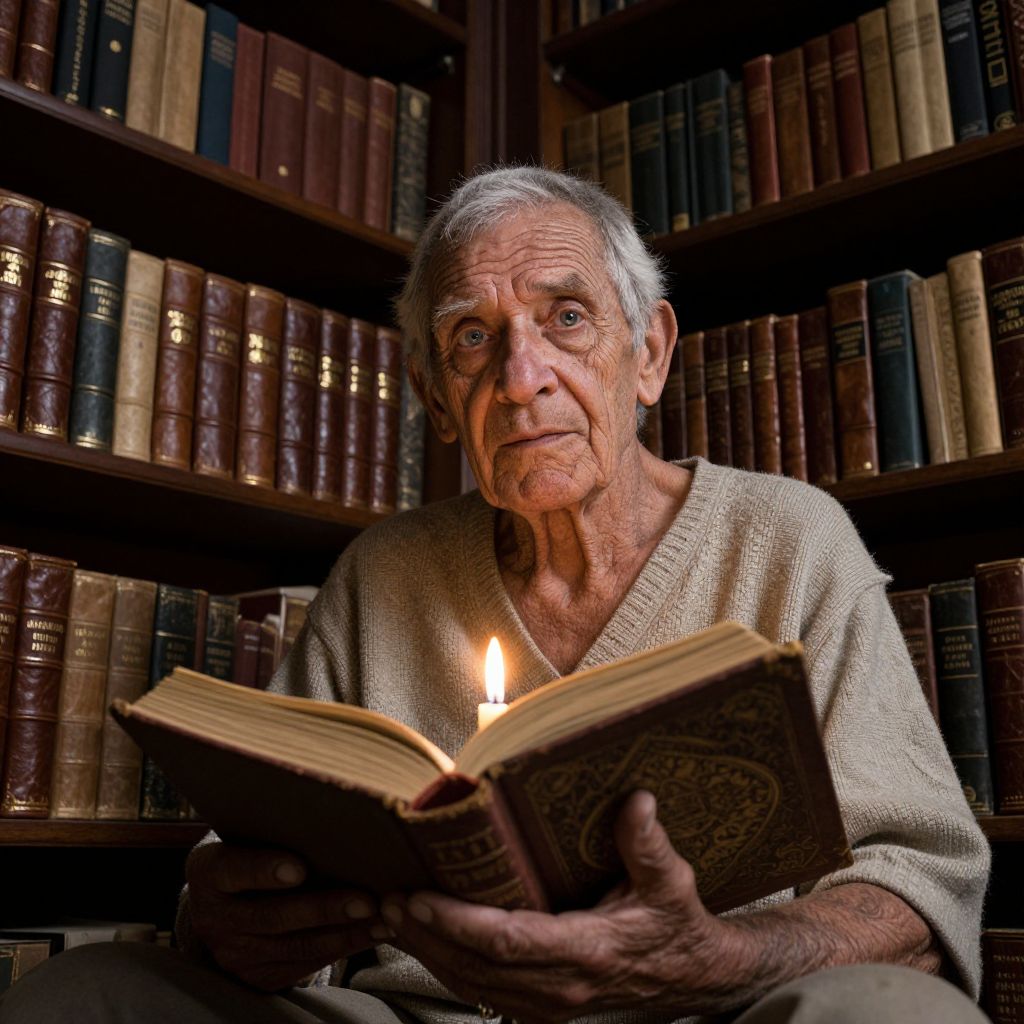 An elderly man with a contemplative expression reads a large, antique book by candlelight in a cozy library filled with classic leather-bound books. The warm lighting highlights the texture of his sweater and the detailed patterns on the book cover, creating a nostalgic and intimate atmosphere.