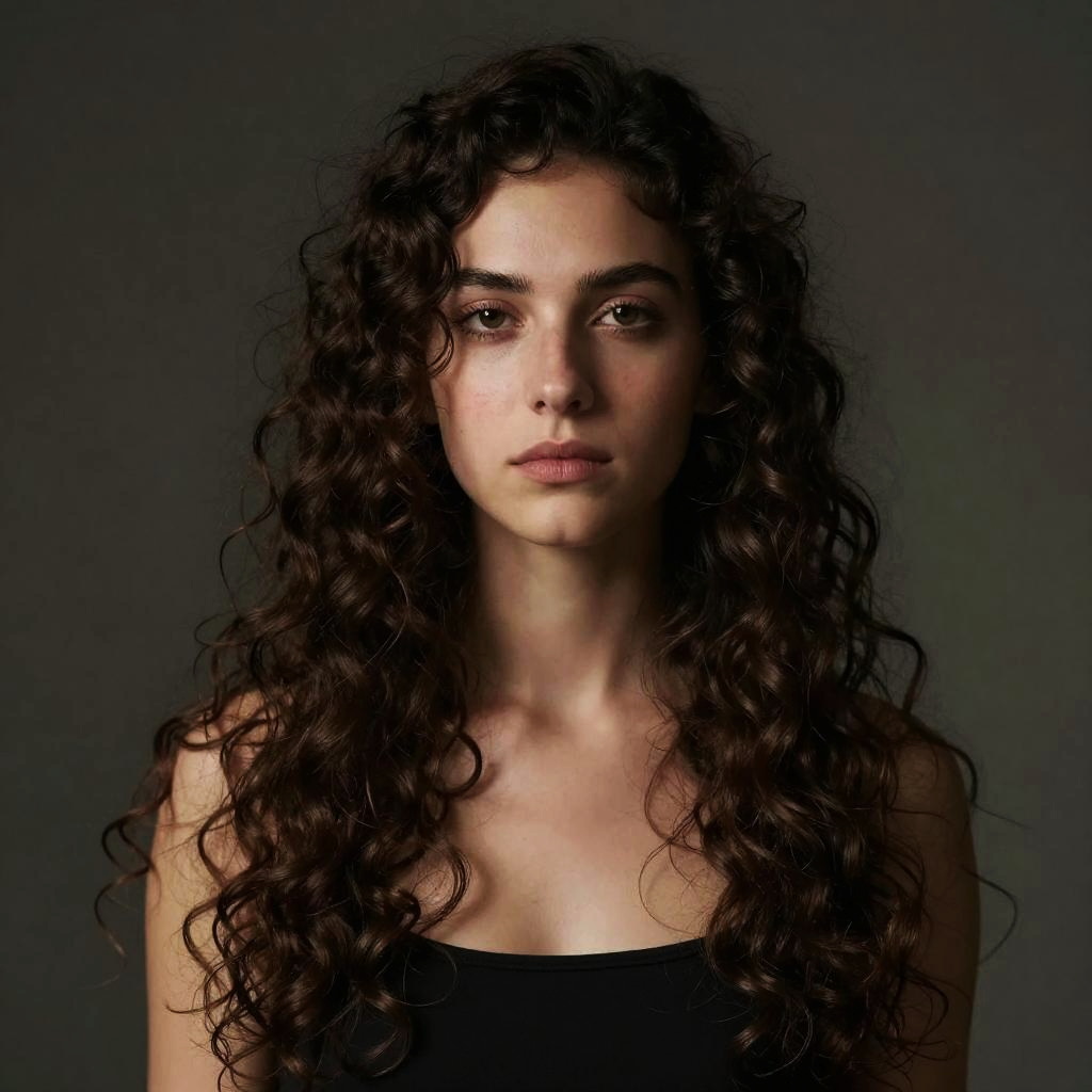 Portrait of a Woman with Long Curly Hair and Natural Makeup